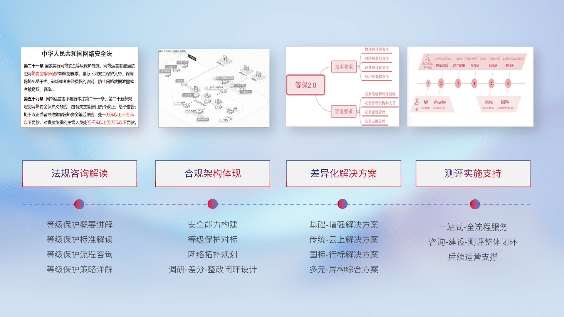 通过专业的法律咨询解读、、、、合规架构体现、、、、差异化解决方案、、、、测试实施支持等服务,,,为客户量身打造等保合规体系。。。。